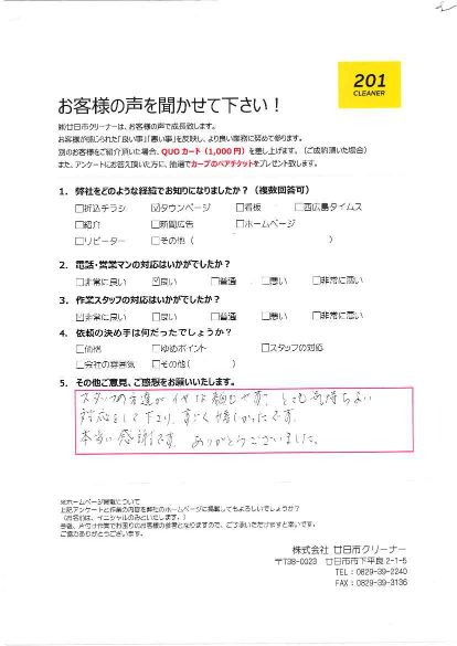 また、この度は急な転居とのことで見積から作業まで最短スケジュールで行うことができ、作業完了後のアンケートに「気持ちのよい対応を・・・感謝です」とご記入いただき、こちらこそ作業スタッフの対応に高評価をいただき嬉しく思います。